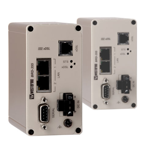 • BRD-355: Industrieller ADSL/VDSL Router, 1 x RS-232, 300 bit/s – 115.2 kbit/s, 2 x Ethernet TX, 10 Mbit/s or 100 Mbit/s, 1 x DSL, RJ-11